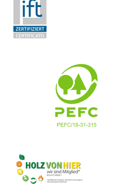 Die Kanteln sind nach DIN EN 204 D4 verleimt - auf Wunsch PU-verleimt - und sind IFT-zertifiziert. Das Holz stammt auf PEFC-konformen Quellen; wir liefern auch Holz-von-Hier zertifiziert nach Norditialien, Österreich, Bayern und Baden-Württemberg.